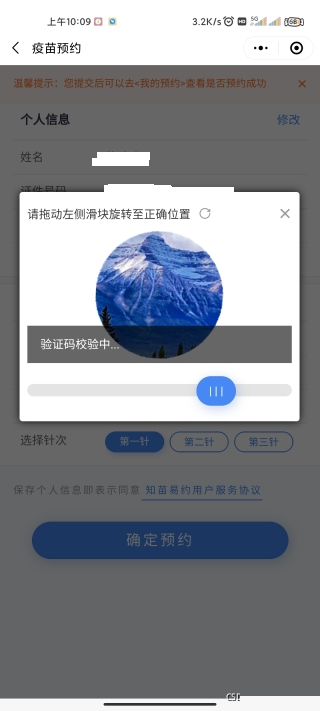 知苗易约小程序在用户预约疫苗时,会触发一种特殊的旋转摆正验证码。这种验证码的目的是为了区分人类用户和自动化程序。它通过显示一张背景图片和一个被旋转的小块图片,用户需要拖动旋转小块直到它与背景上的缺口完全对齐。这种机制利用了人类视觉的精确判断能力,而机器如果没有高级图像处理能力,则难以快速完成。