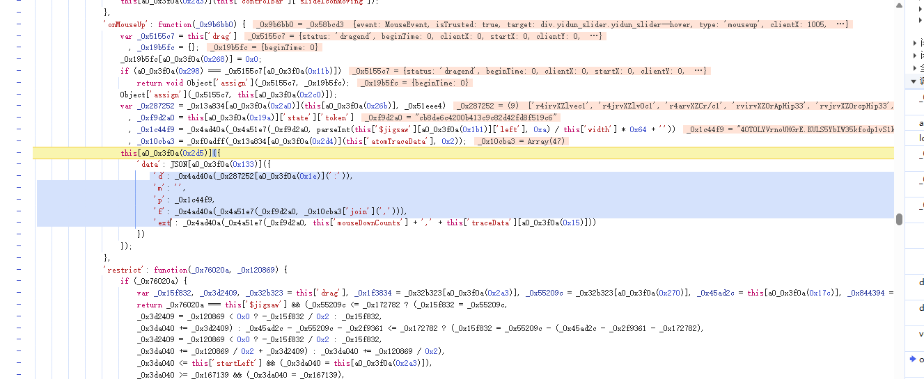 在onMouseUp中,轨迹点先以冒号连接生成中间字符串,再经加密函数处理得到d字段。滑块最终left值换算为百分比后加密为p字段。f字段则结合token与轨迹数组序列加密,ext字段额外包含鼠标按下次数与总轨迹长度。