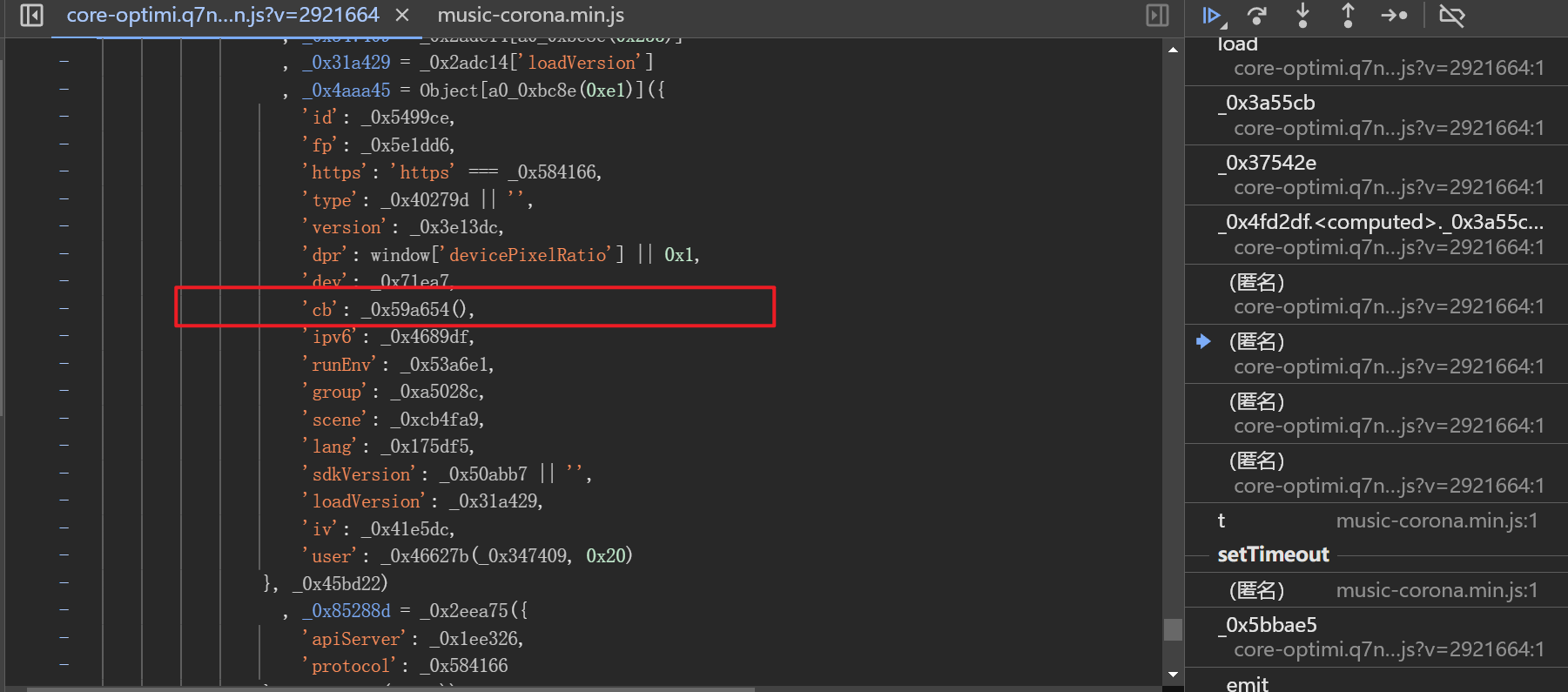 此时需借助调试启动器逐步回溯调用栈。耐心向上追踪,最终定位到cb值的返回函数。该函数被包裹在混淆代码内部,为避免逐行扣代码耗时过长,可选择整文件导出并补全运行环境。导出时注意将目标方法挂载到window对象,否则外部无法调用。