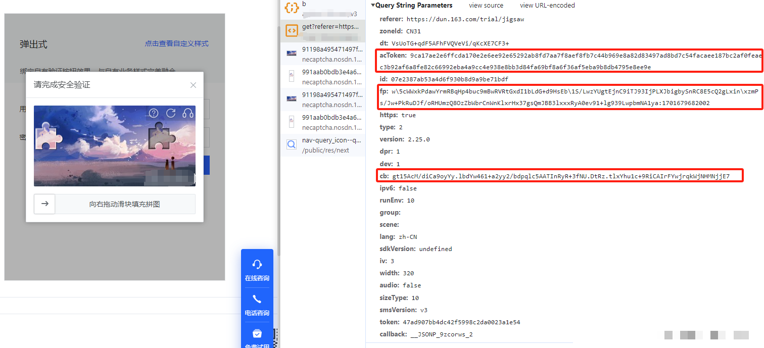 验证码弹出后,前端会向指定的信息接口发起请求,以获取验证所需的图片资源和配置数据。请求参数中包含多个字段,其中acToken、fp以及cb是动态生成的,必须通过逆向分析前端JavaScript代码来获得。