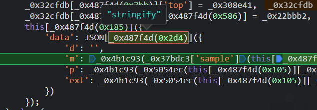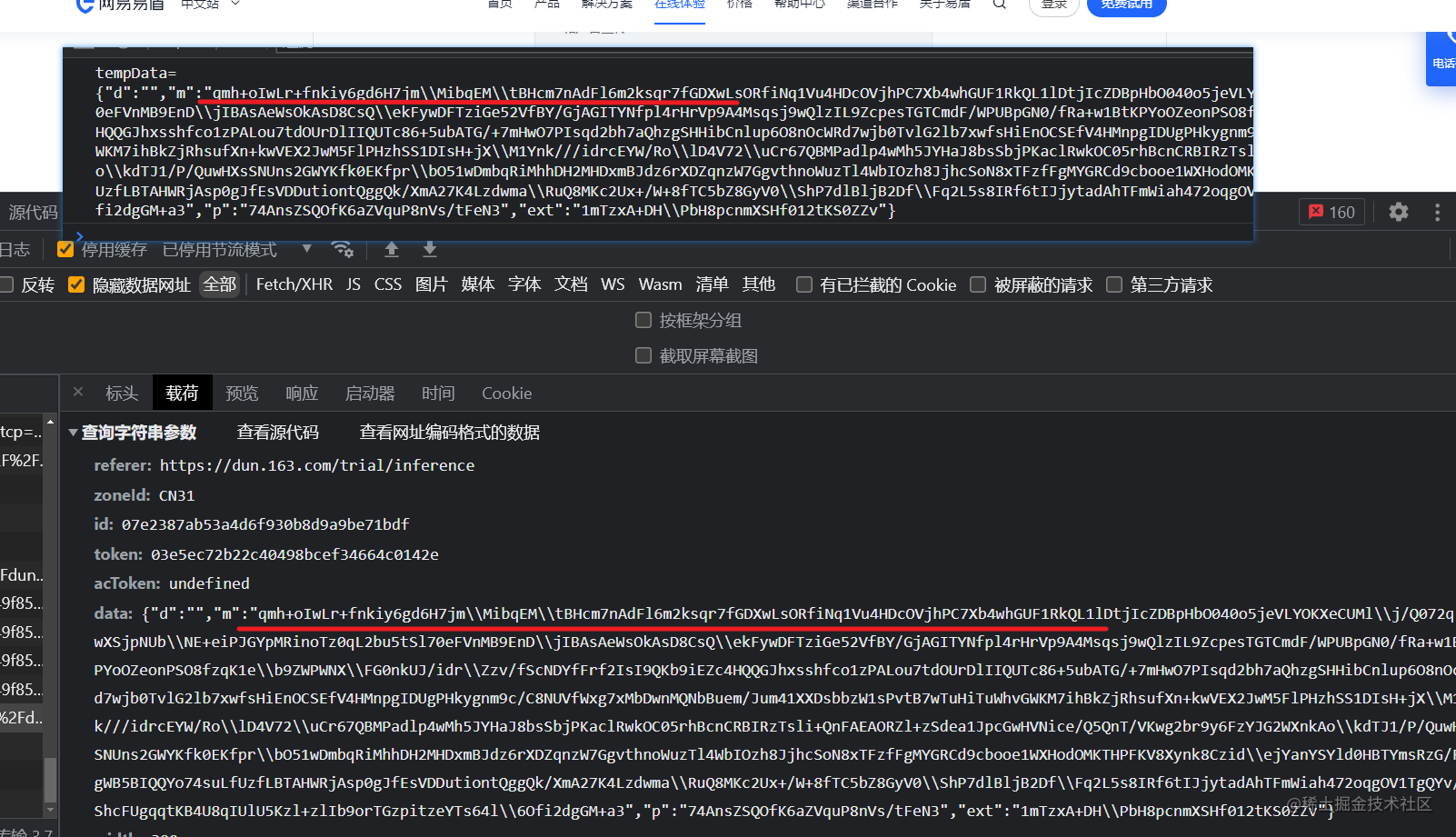 借助浏览器开发者工具或Fiddler代理工具可完整捕获请求详情。data是一个经过JSON.stringify的字符串,内部包含d、m、p、ext子字段,分别对应不同层面的加密结果。初步观察显示,data长度和内容随轨迹长度变化而波动,体现了行为数据的深度融合。掌握这些变动规律是后续调试的前提,确保构造出的参数与真实请求高度一致。