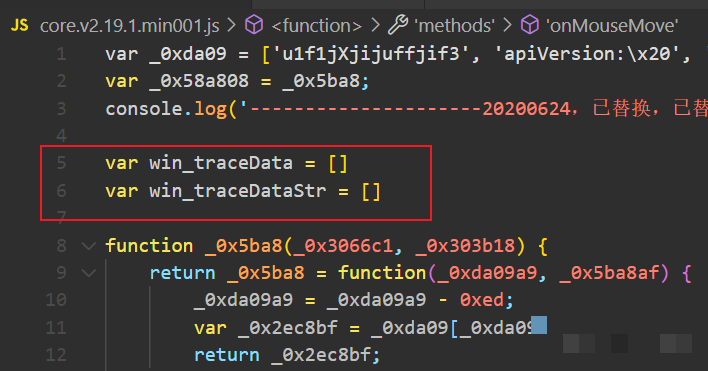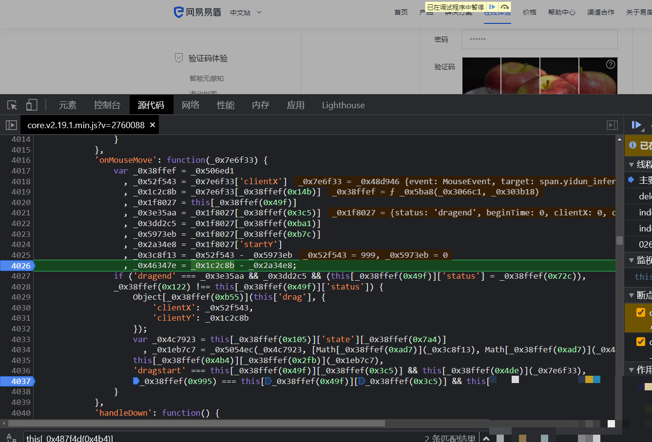 全部核心逻辑集中在core.v2.19.1.min.js混淆文件中。onDragEnd事件负责最终参数组装,而轨迹采集的核心发生在onMouseMove处理中。每次鼠标移动时,系统会读取当前坐标、计算与起始时间的差值,然后调用加密函数生成中间结果并推入traceData数组。该数组后续成为m参数的基础数据源。