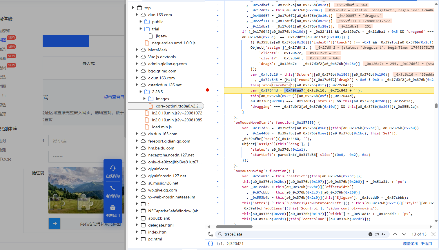 该加密函数的第一个参数为token,第二个参数则是原始轨迹数组的序列化字符串。扣取Webpack模块后,将此函数导出到全局,即可直接生成traceData。实际操作显示,这一字段的正确构造对最终验证通过率影响显著。结合原始轨迹数据,traceData能够完整还原整个拖动行为,为后端行为分析提供真实依据。
