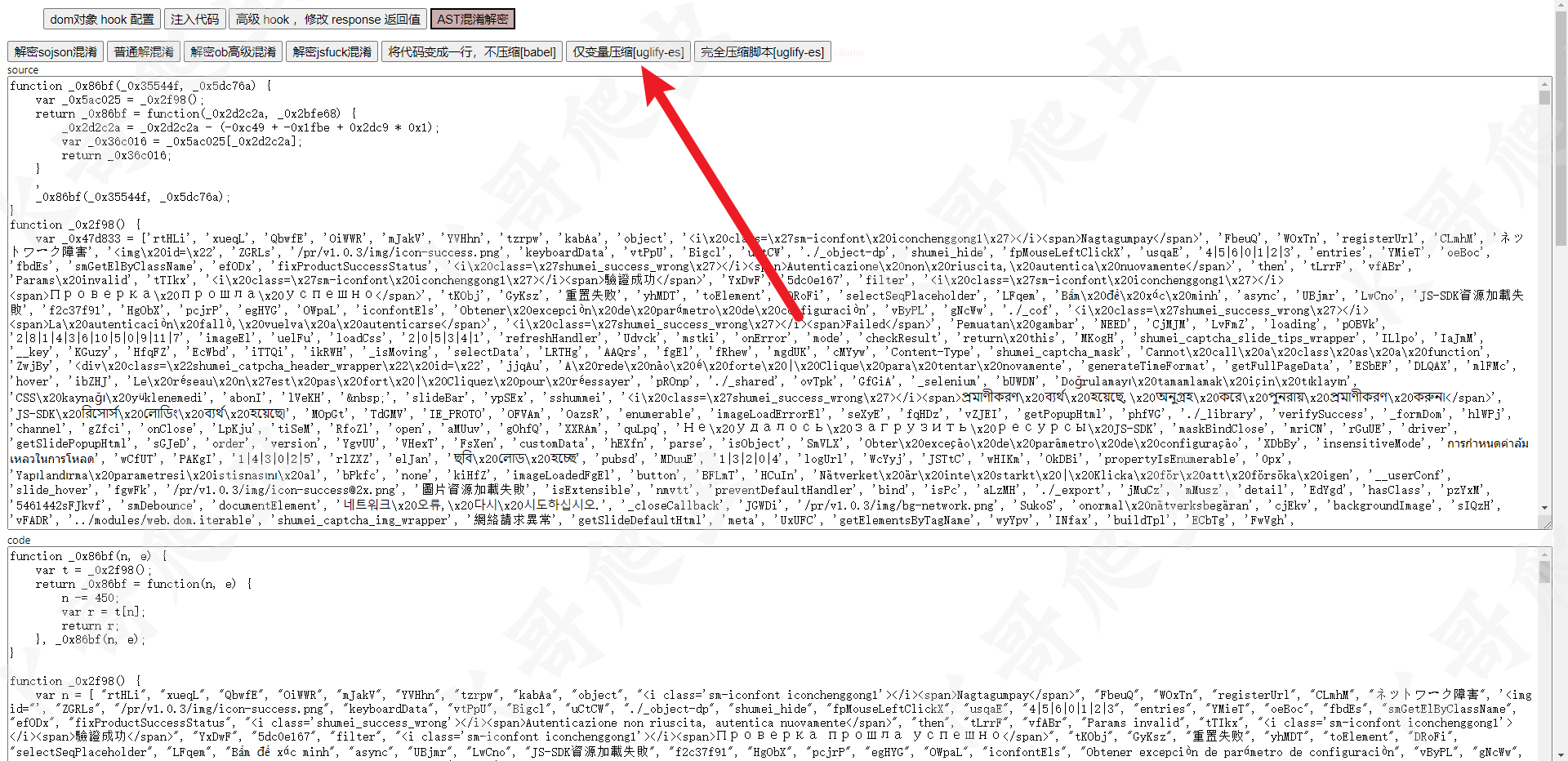 混淆代码采用常见的OB(Obfuscator)方案,变量名被替换为无意义字符,字符串加密,控制流平坦化。要解密可借助AST工具或专用解混淆器。解混淆后,fp生成函数大致位于全局作用域的某个闭包中,典型特征是调用canvas.toDataURL()获取指纹。