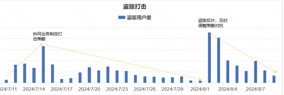 从上线首日起,安全团队全天候监控业务数据,建立风险标签体系与反外挂机制。首月高风险开挂用户占比仅0.87%,高风险外挂用户占比低于行业平均水平5%,整体外挂风险评级达到优级。同时累计检出133个渠道盗版包,关联盗版用户超过万人。通过自动化策略布控,当前日盗版用户占比稳定低于0.1%,远低于行业均值,盗版风险同样评级为优。