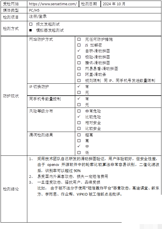 商汤科技在PC注册页面使用了自主开发的滑动验证码。该机制要求用户拖动滑块完成拼图匹配。但测试显示,这种验证码很容易被模拟环境绕过,识别成功率超过95%。