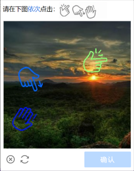 点选验证强调位置准确性和时序自然性。图像中可能有多个干扰元素,用户需按提示点击正确目标。系统不仅检查坐标是否落在有效区域,还分析点击间隔是否在200-800毫秒之间,以及整体顺序是否体现人类视觉扫描习惯。