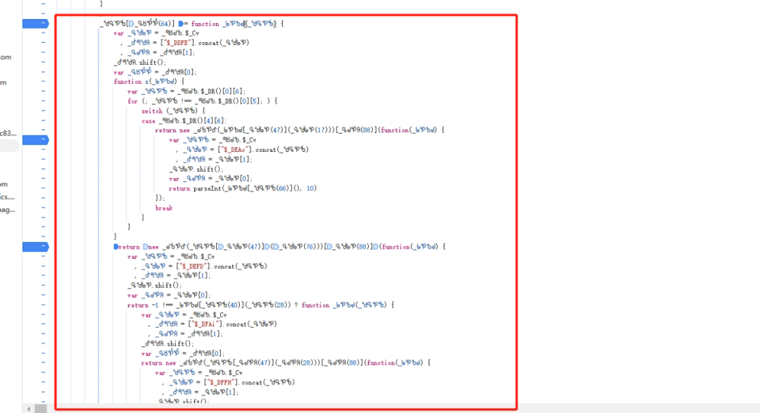 lot与lotRes处理完后,还剩最后一个拼接函数需要还原。该函数同样属于混淆对象下的方法,结构包含多个switch分支和原型方法调用。扣取时要把整个闭包连同依赖数组一起拿下。