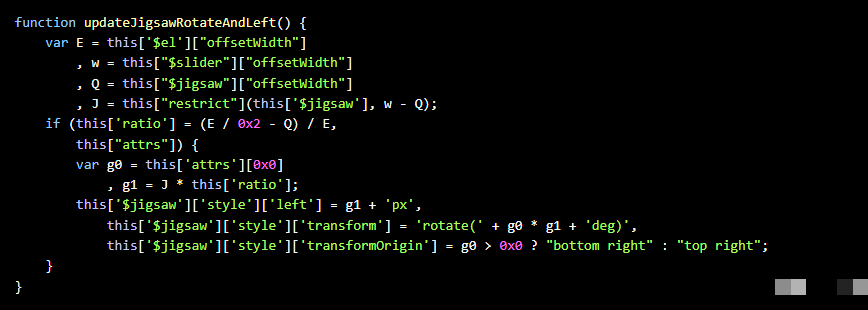 attrs[0]即为旋转系数k,实际旋转角度θ = k × x,其中x为滑块的归一化偏移量(通常乘以ratio系数,ratio约为滑块宽度与容器宽度的比值)。通过反复测试不同偏移下的前端表现,可以确认旋转原点与角度计算公式。