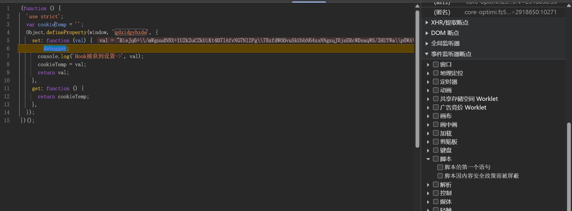 想定位生成位置,最有效的方法是hook这个属性的setter。在脚本最前面注入一段代码,当属性被设置时自动断点。这样就能顺着调用栈找到加密逻辑。实际操作中,清空缓存后刷新页面,结合事件监听断点,就能快速定位。