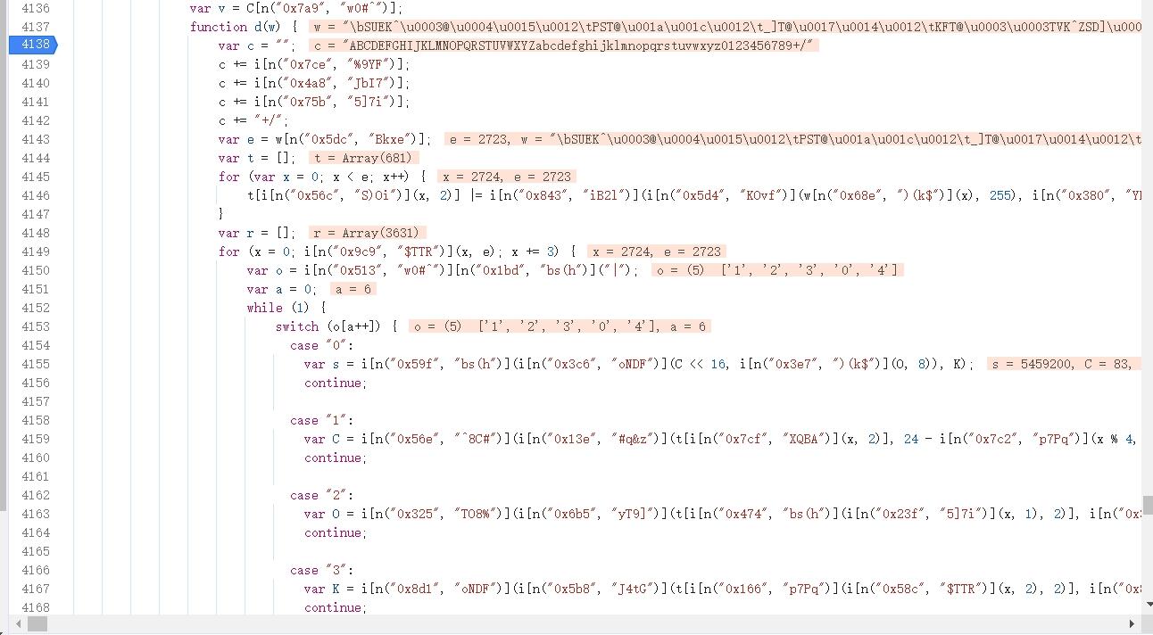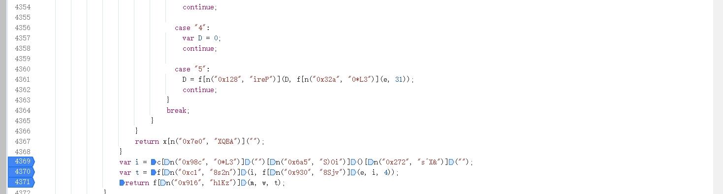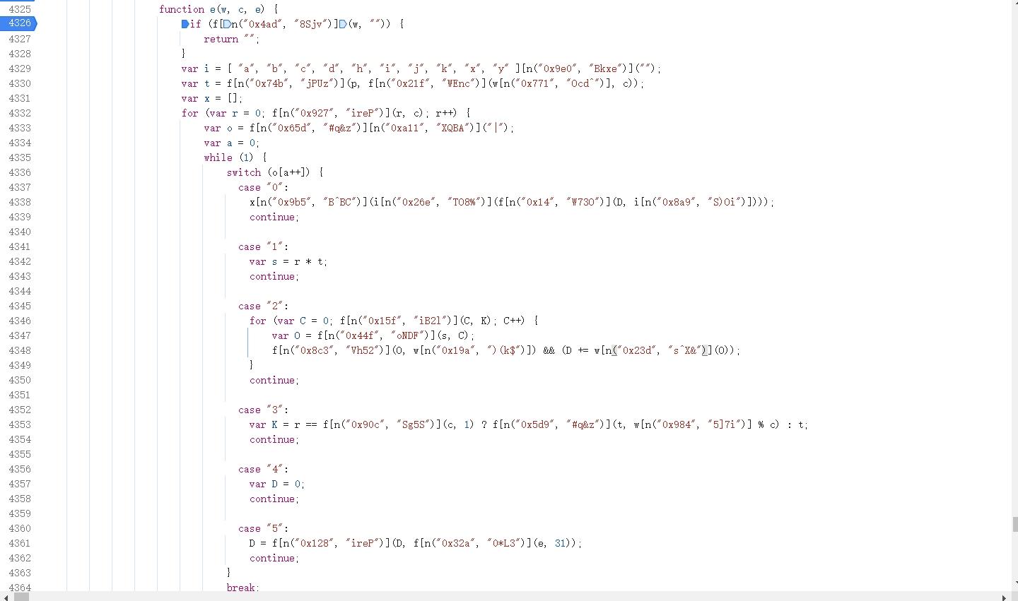进入主加密函数后,会发现代码经过混淆处理,变量名乱码,逻辑被平坦流打散。这时可以用简单变量还原工具清理代码,再跟进关键调用。最终发现data由ek轨迹明文和自定义加密函数组合生成。