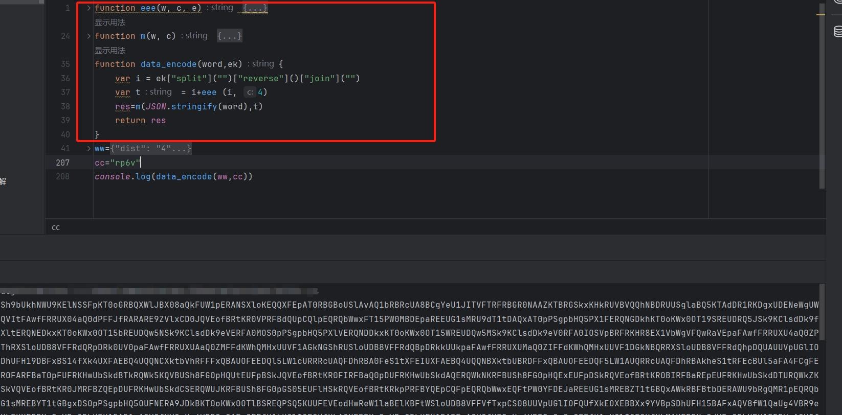 第二种方法更追求精简,直接分析翻转、块处理和base64步骤。翻转ek后传入分块函数,该函数按指定长度切割字符串,累加字符码后乘系数取模,从固定字符池选字符拼接。异或环节用循环逐位处理,最后包装成标准编码格式。
