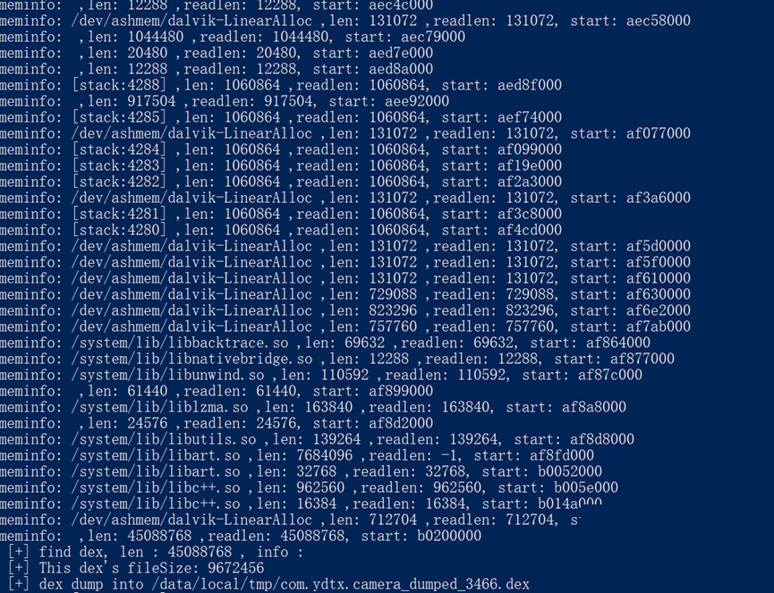 adb push drizzleDumper /data/local/tmp/\nchmod 777 /data/local/tmp/drizzleDumper\nadb shell /data/local/tmp/drizzleDumper com.ydtx.camera执行后工具会循环扫描内存并dump出多个DEX文件。这些文件通常大小接近43MB,说明已经成功捕获了加载后的真实代码。相比其他复杂方法,这个工具上手快,适合小白先尝试。如果dump过程不顺利,可以检查模拟器权限设置或重启应用再试。