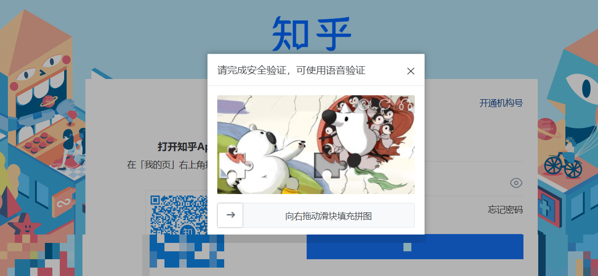 知乎网站的登录系统采用了易盾提供的滑块验证码防护。当用户完成账号密码输入并点击登录后,验证码界面会立即出现。这要求用户拖动滑块完成拼图对齐,以验证是真实人类操作。逆向这个过程能帮助我们实现自动化登录工具。