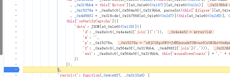 验证参数的data是JSON对象,d代表轨迹加密,p为距离加密,f为轨迹加密,ext为长度加密。这些使用相同加密函数,我们提取调用。原代码中使用了混淆变量,我们通过全局方式复用。