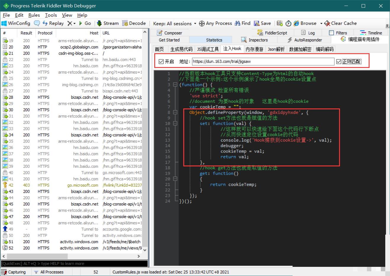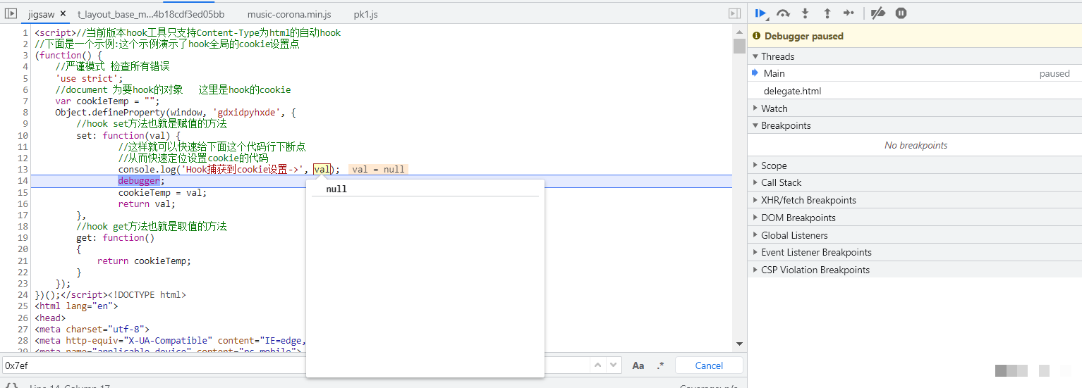 全局搜索fingerprint相关字符串,能定位到赋值来源。进一步调试显示,该值通过特定函数从window.gdxidpyhxde字段提取。使用Fiddler抓包并编写Hook脚本后,刷新页面即可观察到生成过程:首次加载时该字段为null,随后触发生成逻辑。