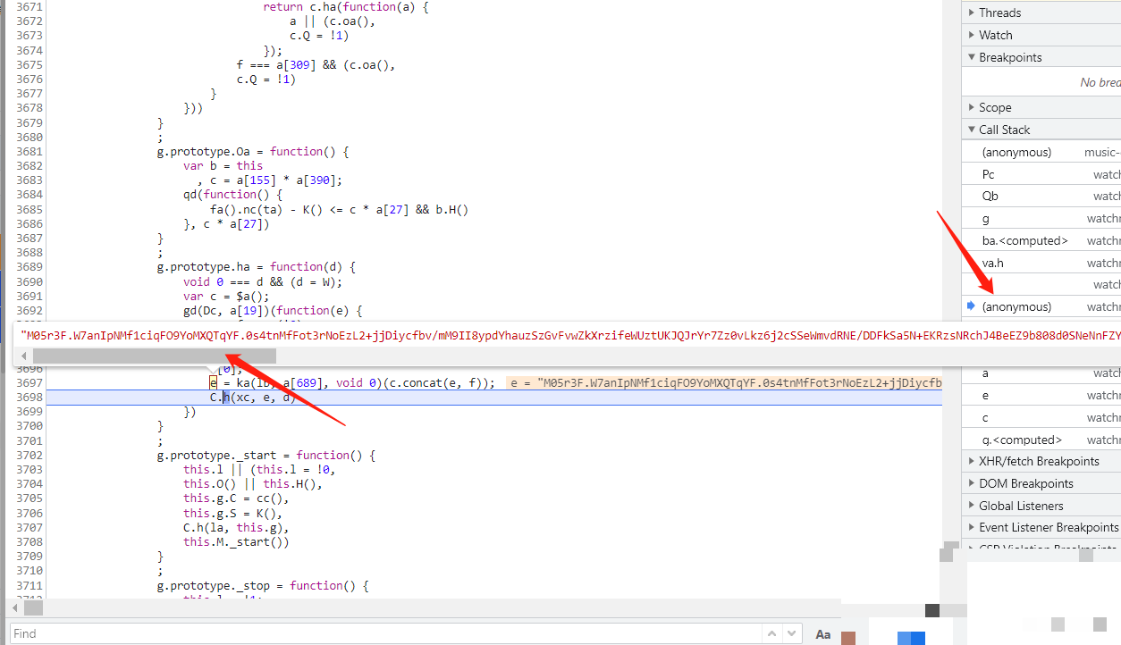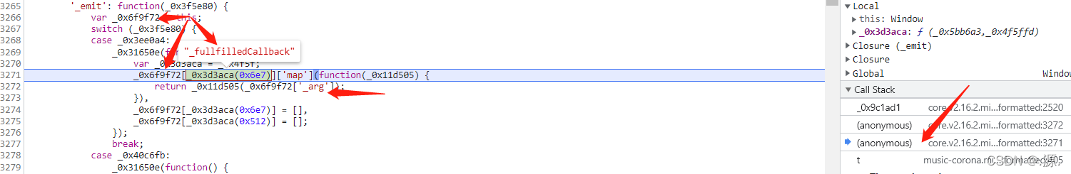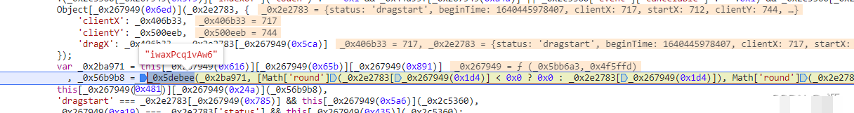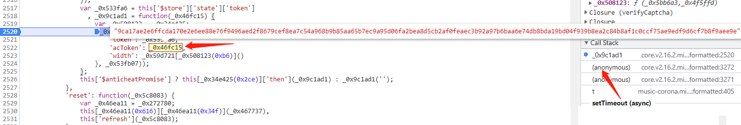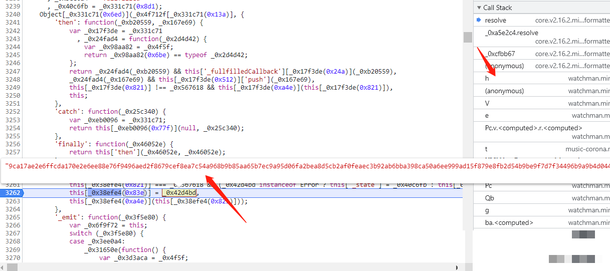 进入acToken生成函数,断点显示加密结果已就绪。全局搜索特定十六进制索引(如0x6e7对应1767),发现其实际指向一个大型数据数组的下标取值。这正是JS混淆的典型手法:通过数字映射隐藏真实变量。