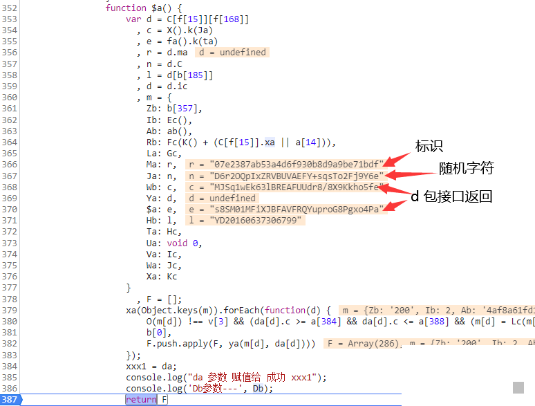 d包是b包参数的前置依赖,清空Cookie后重新发起请求即可捕获。目标函数中出现数组级联操作,重点关注$a()初始化逻辑。