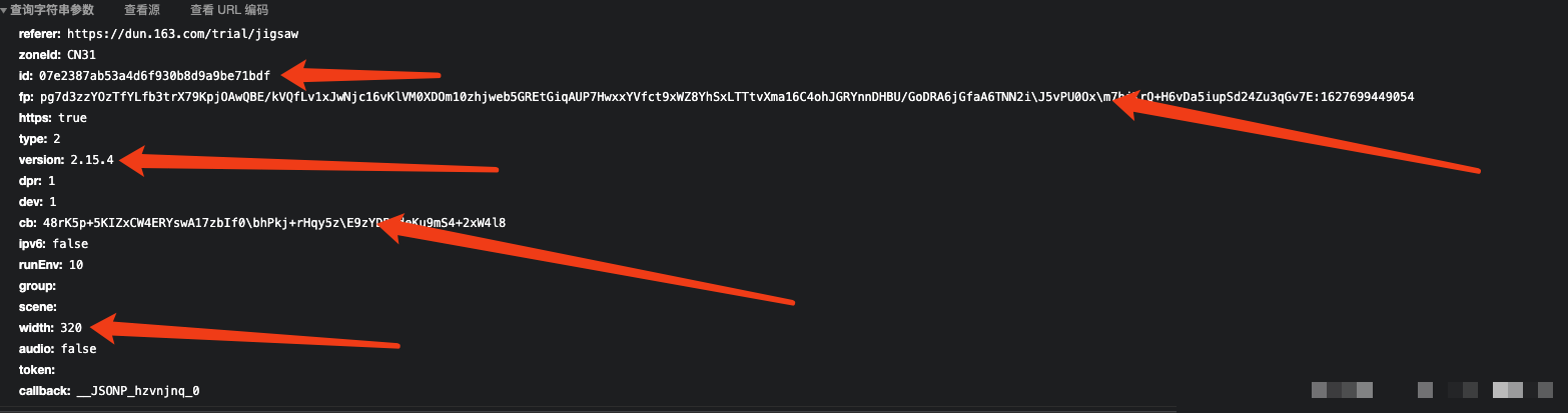 打开开发者工具刷新页面后,你会看到一个关键的GET请求:https://c.dun.163.com/api/v2/get。这个接口需要几个重要参数:id代表站点唯一标识,fp就是我们要破解的指纹,cb则是随机生成的回调字符串,width控制图片尺寸。服务器返回的数据包含token、背景图和滑块图,这些是后续验证的基础。