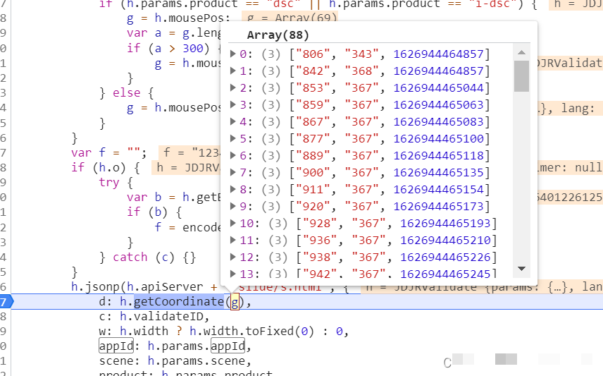 参数d的生成依赖于前端JavaScript逻辑。通过调用栈追踪,可以定位到具体加密函数。设置断点后,滑动滑块即可捕获执行过程。g数组正是轨迹核心,由多个三元组组成,每个元素包含x坐标、y坐标和时间戳。