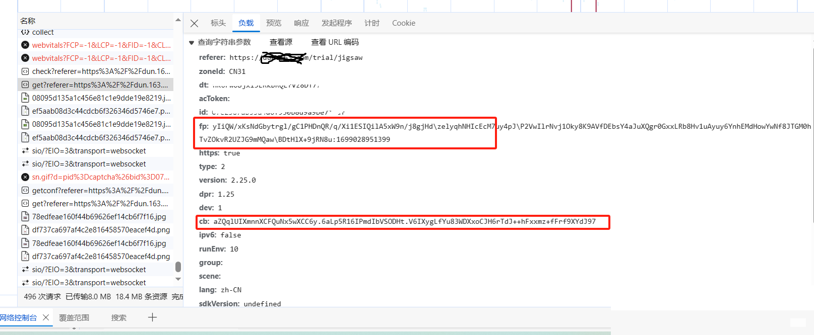 完成fp与cb后,构造完整payload发送GET请求。典型参数包含referer、zoneId、dt、acToken、id、version等字段。示例payload结构: