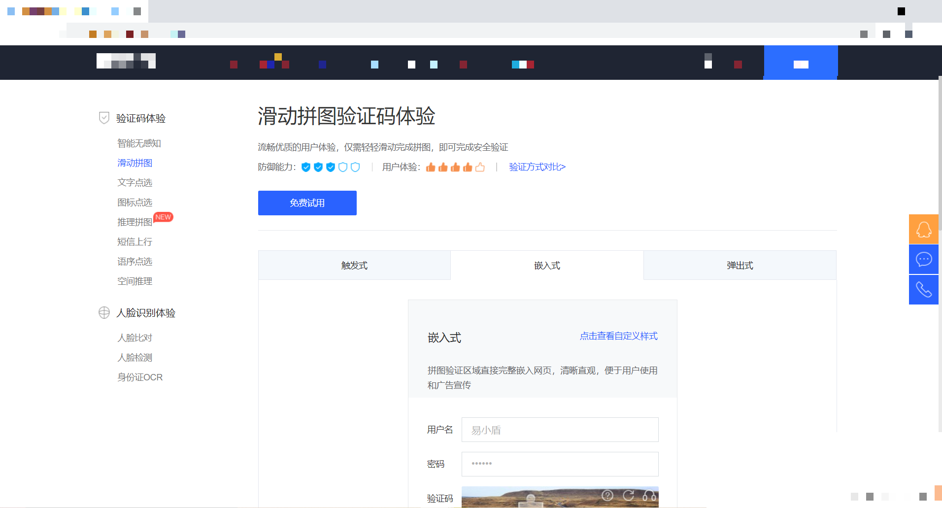 触发嵌入式滑块验证码界面